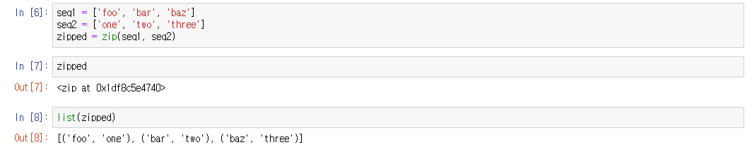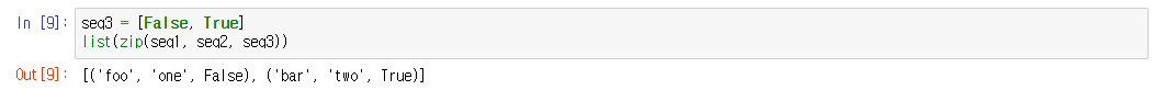 (원래는 [('foo', 'one', False), ('bar', 'two', True), ('baz', 'three')]를 예상할 수도 있지만, 실제로는 가장 짧은 크기가 기준이 된다.)