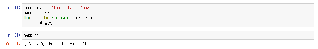 (some_list라는 리스트와 mapping이라는 빈 dict를 만들어주고 enumerate함수를 사용하여 순서대로 mapping안에 자료를 넣는 함수이다. mapping[v]에서 v는 key값이 될 것이고, i는 value값이 된다.)