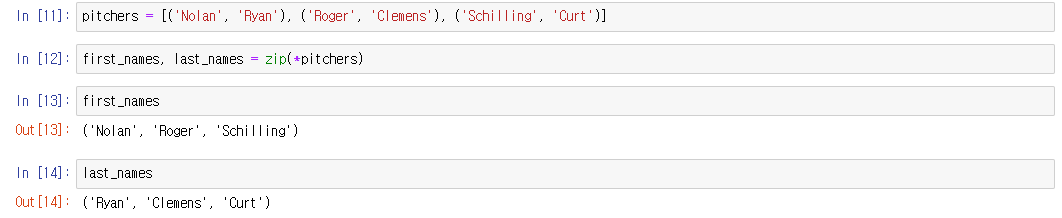 (pitcher에는 3개의 튜플이 있고, 1개의 튜플에는 2개의 값이 있다. 각 튜플의 첫 번째 값은 first_names에 들어가고 두 번째 값은 last_names에 들어가게 된다.)