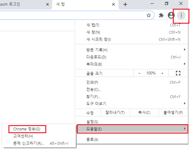 그것을 오른쪽 상단 점 세개 -> 도움말 -> Chrome 정보를 클릭하여 크롬의 버젼을 확인해 줍니다.