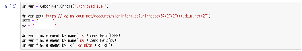driver에 크롬드라이브를 불러와주신 후, 다음 로그인 화면 페이지 url을 입력해줍니다.