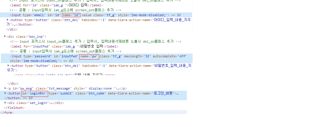 (아이디와 패스워드는 name으로 가져올 예정이며, 클릭을 위한 로그인은 id로 가져올 것입니다.)