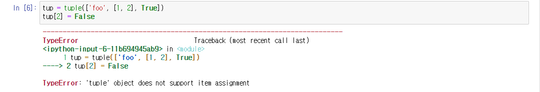 1-4 튜플은 한번 생성된 경우 그 값을 변경할 수 없다. (True -> False로 변경하려 했지만 오류가 난다)