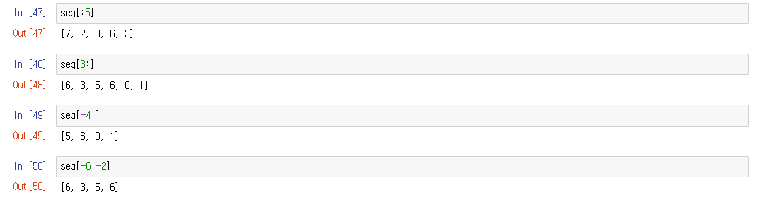 seq[3:] -> 4번째부터 마지막 값까지 리스트 추출