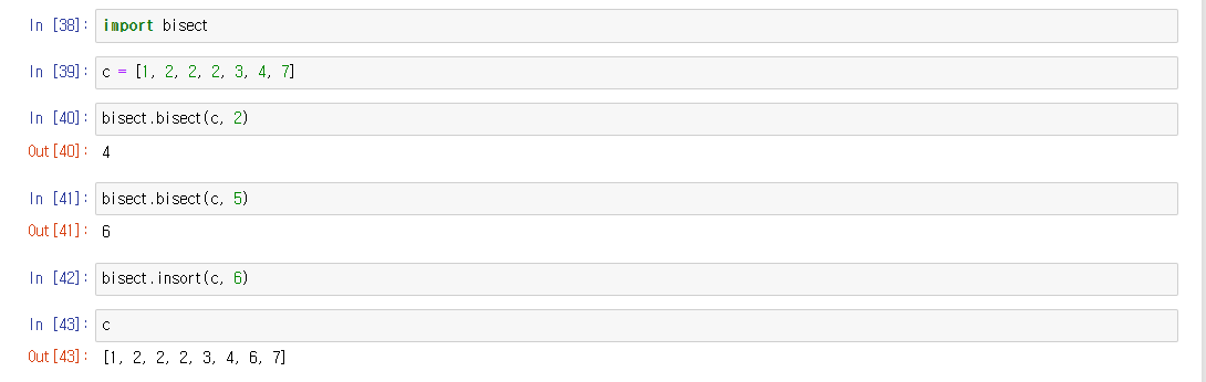 bisect.bisect(c, 2)는 c리스트 내 정렬된 상태를 유지할 수 있는 최대 위치 즉, 1, 2, 2, 2 이후에 5번째에 들어갈 수 있으므로 결과값은 4(0부터 시작이므로)가 출력되고, bisect.bisect(c, 5)는 c리스트 내 5가 들어갈 수 있는 위치는 1, 2, 2, 2, 3, 4 이후인 7번째 위치이므로 결과값이 6이 출력된다. 마지막으로 bisect.insort(c, 6)은 바로 c리스트 내 6을 추가해준다.