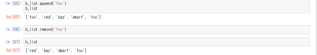 (맨 뒤에 'foo'를 추가하면 맨 앞과 맨 뒤에 foo라는 값이 생기는데 이 때 remove('foo')를 한다면 앞에 있는 foo값이 제거된다.)